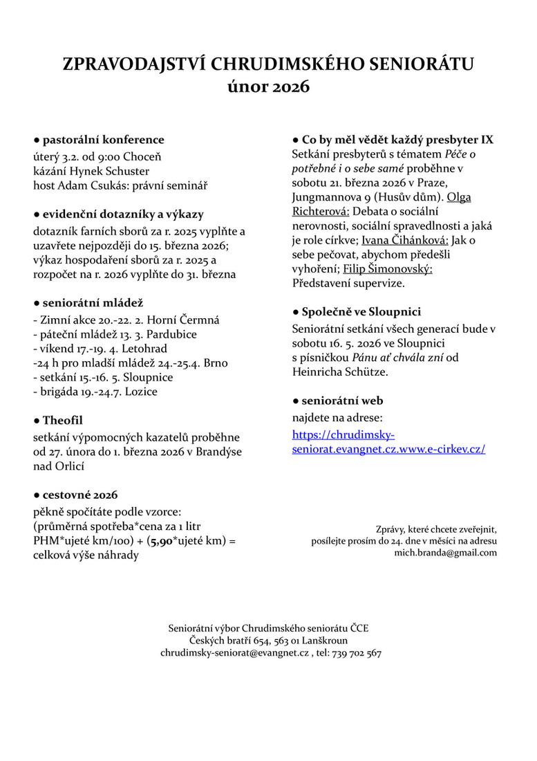 Zpravodaj Chrudimského seniorátu pro únor 2026.
